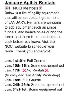 (HALF COURSE/NO COURSE SET UP: If we have a half course/no course set up for the weekend you may add jumps, tunnels and weaves to the course as you wish. On HALF COURSE/NO COURSE weekends you do not need to clean up any equipment after the rental is done.)